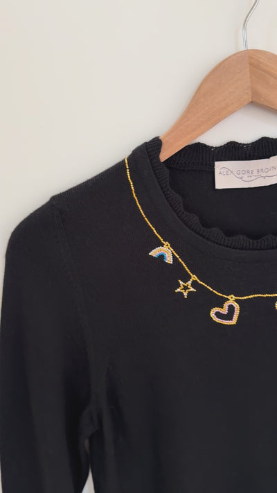 Echo your beloved childhood charm bracelet with our Charm Necklace Sweater. Hand embellished in our Cotswold studio with your favourite lucky Rhinestud charms and made from soft merino wool, this sweater will become an instant favourite.